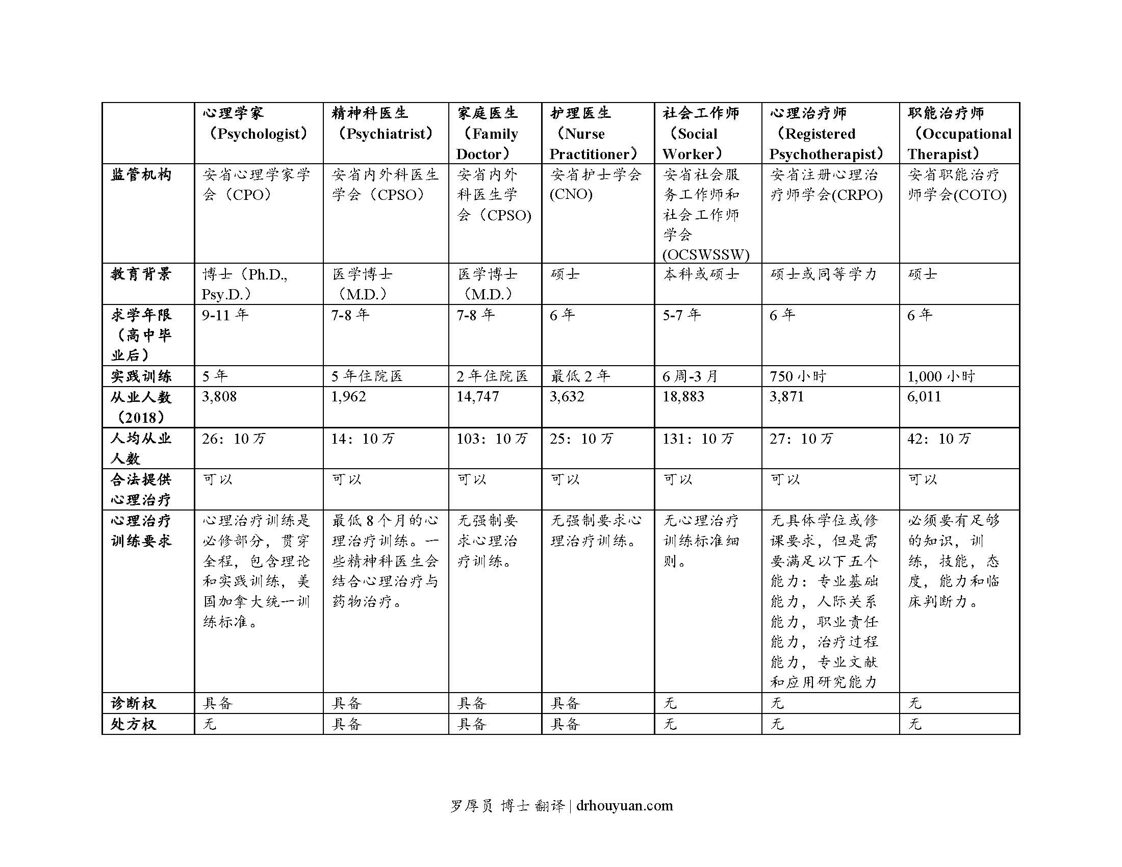 安大略省心理学会(Ontario Psychological Association)制作了一张表格,总结了以上提到的各专业人士的区别: